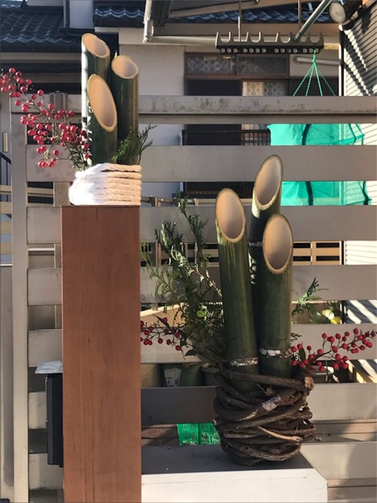 材料は山から採ってきた竹、山藤のつる、ヒノキの葉、南天の実です。